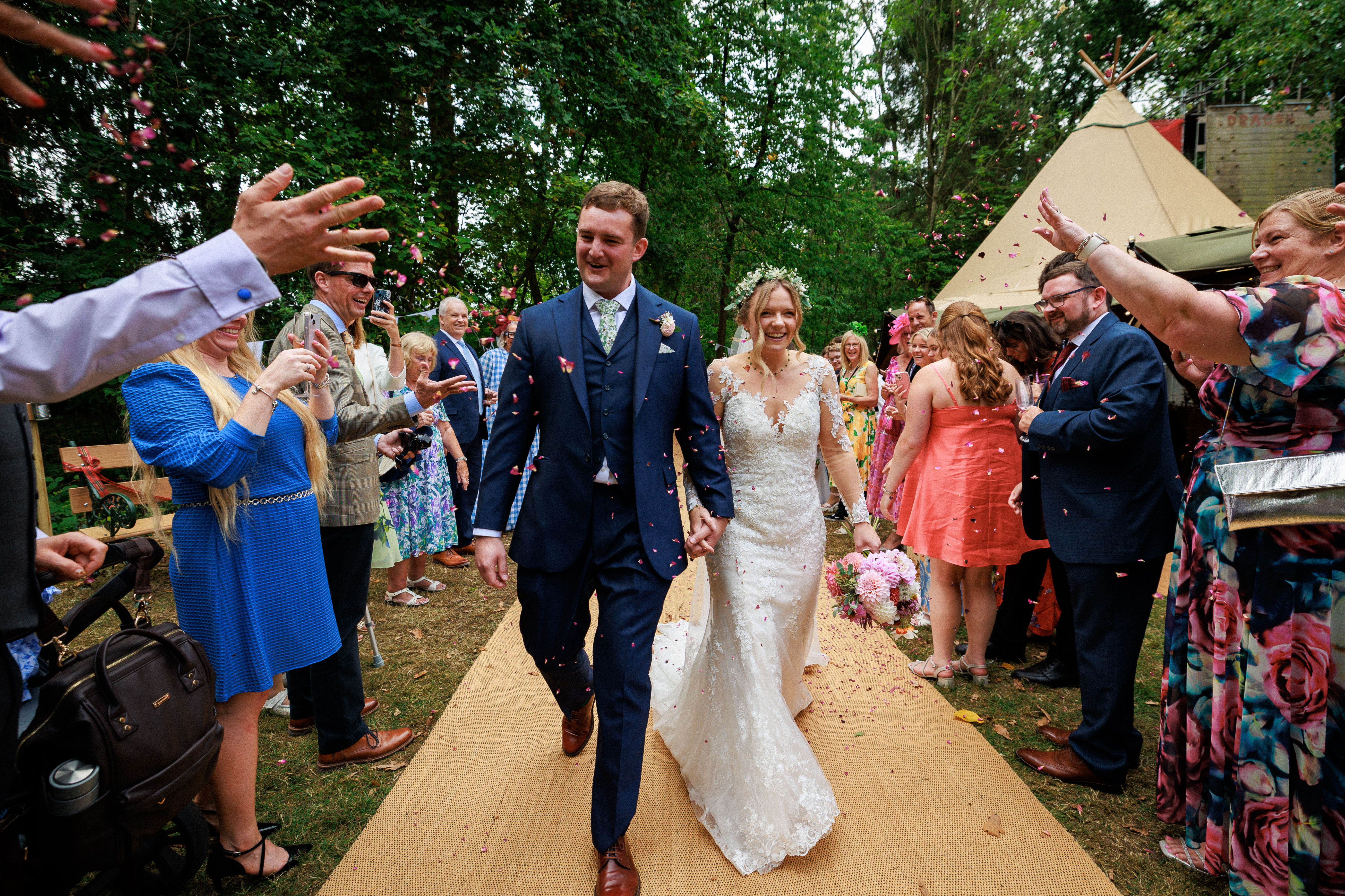 A beautiful blend of tradition and laid-back celebration, beginning at All Saints' Church before moving to Cox Wood Campsite, transformed into a tipi-filled wedding haven. Relaxed, outdoorsy, and full of life, the day flowed with great food, drinks beneath the canopy, dancing under open skies, and a live band keeping the energy high well into the night.